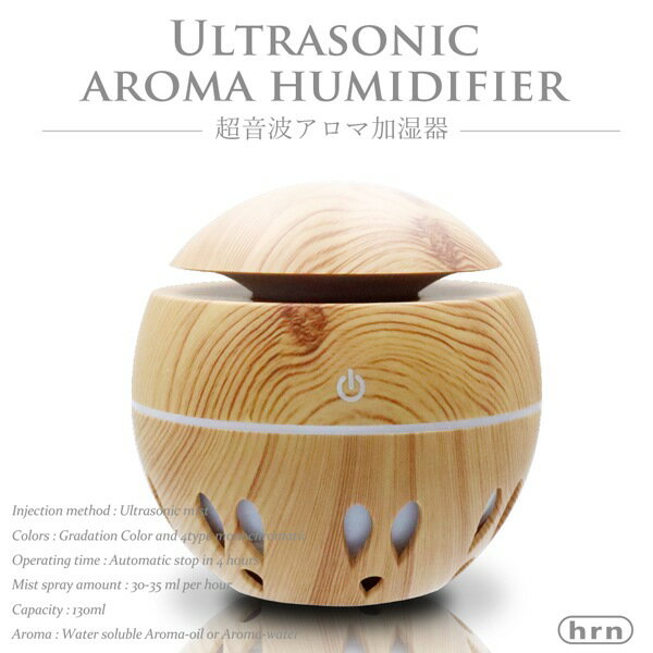 LEDライト搭載 アロマディフューザー 超音波加湿器 イルミネーション USB電源式 タッチセンサー式【 超音波式加湿器 USB加湿器 光る 卓上 デスク PC 寝室 おしゃれ 丸 小型 コンパクト 木目柄 プレゼント 】 ◇ 加湿器HRN-545